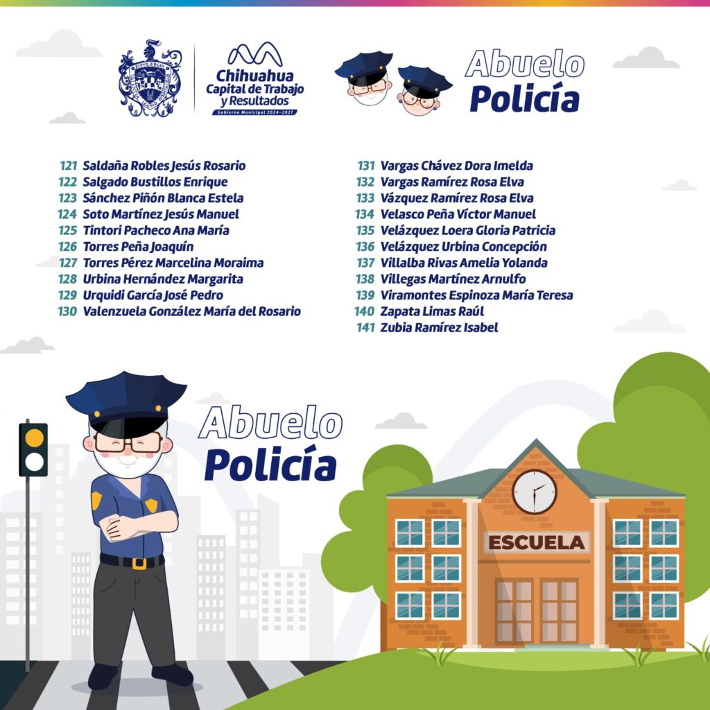 H. Ciudad de Chihuahua, Chih., a 17 de marzo de 2026_.– El Gobierno Municipal de Chihuahua a través de la Dirección de Desarrollo Humano y Educación, da a conocer la lista de las y los seleccionados del programa “Abuelo Policía 2026”, que tiene como objetivo que los adultos mayores realicen actividades para generar ambientes escolares seguros para las niñas, niños y adolescentes que asisten a las escuelas públicas del municipio de Chihuahua.