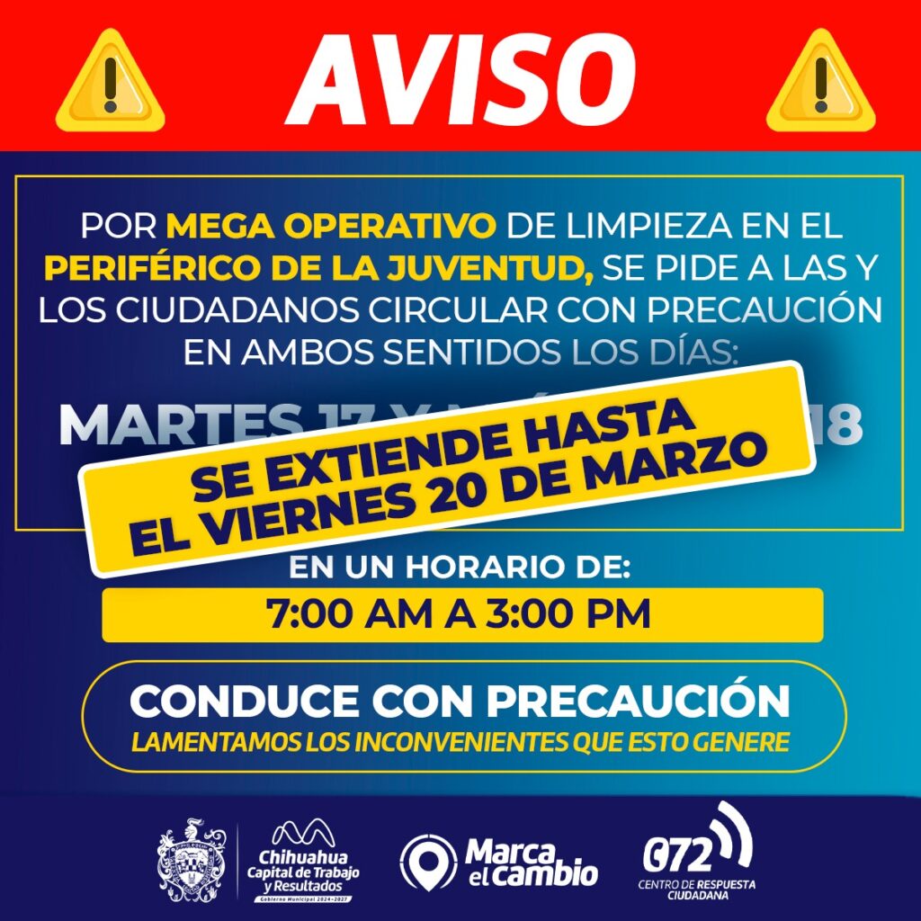 H. Ciudad de Chihuahua, Chih., a 18 de marzo de 2026.- Con el objetivo de tener una ciudad más limpia, ordenada y bonita, el Gobierno Municipal, a través de la Dirección de Mantenimiento Urbano, informa que el Mega Operativo de Limpieza en el Periférico de la Juventud se extenderá hasta el próximo viernes 20 de marzo.