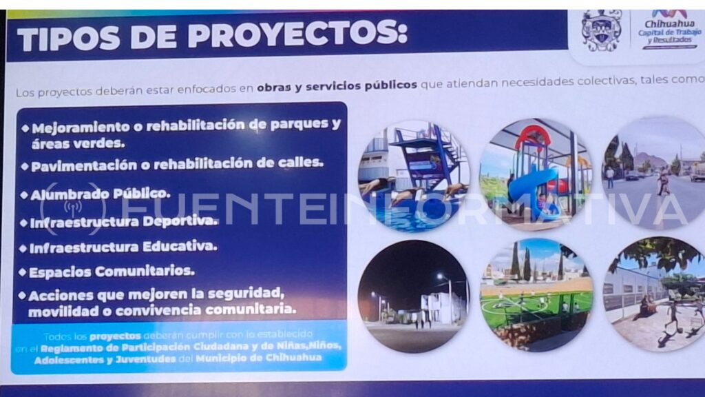 Entre los proyectos que pueden presentarse se encuentran acciones de mejoramiento de parques, pavimentación de calles, alumbrado público, infraestructura deportiva y educativa, así como iniciativas de seguridad y movilidad.