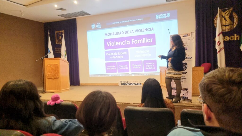 H. Ciudad de Chihuahua, Chih., a 19 de marzo de 2026.- La Dirección de Seguridad Pública Municipal (DSPM), en coordinación con la Universidad Autónoma de Chihuahua (UACh), continúa llevan a las universidades la “Jornada de Prevención Universitaria”, con el objetivo de fortalecer la cultura de la prevención entre la comunidad estudiantil, enfocada en la prevención, detención y atención de la violencia familiar y de género.