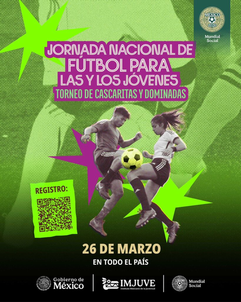 Ciudad de México, a 23 de marzo de 2026. – Este 26 de marzo, México va a jugar en equipo. Canchas, parques y espacios deportivos de todo el país se llenarán de vida con la Jornada Nacional de Fútbol para las y los Jóvenes: Torneo de Cascaritas y Dominadas, una convocatoria del Gobierno de México, a través del Instituto Mexicano de la Juventud, para hacer del fútbol un punto de encuentro, comunidad y transformación.