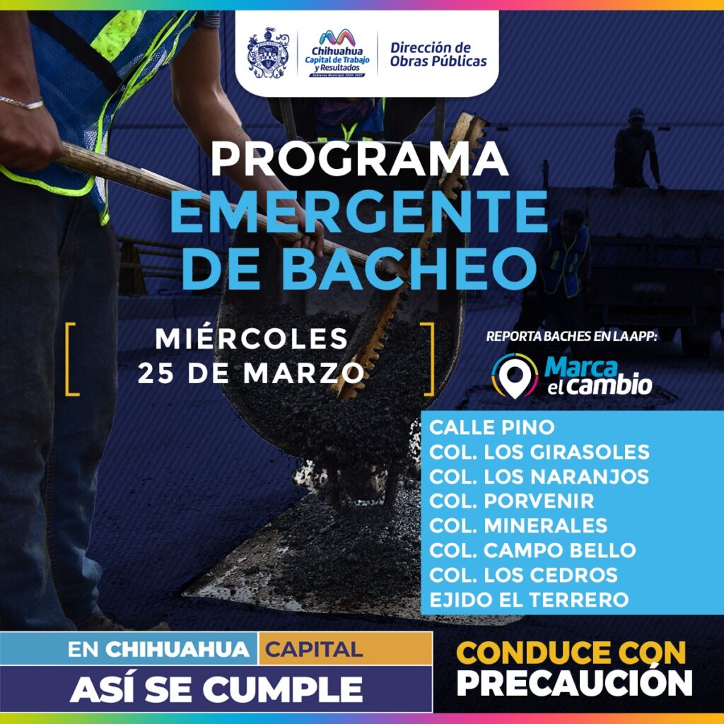 H. Ciudad de Chihuahua, Chih., a 25 de marzo de 2026.- El Gobierno Municipal, a través de la Dirección de Obras Públicas, realizará trabajos de bacheo este miércoles 25 de marzo mediante el programa emergente en las calles de las colonias: Los Girasoles, Los Naranjos, Porvenir, Minerales, Campo Bello, Los Cedros, así como en la calle Pino y en el Ejido El Terrero.