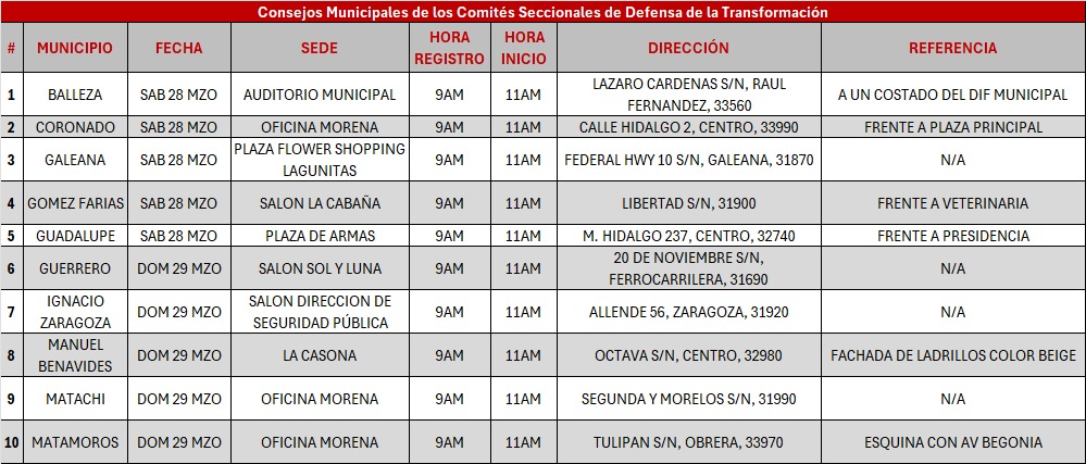 “En el caso específico del estado de Chihuahua, quiero informarles que durante el próximo fin de semana se instalarán los Consejos Municipales en 10 municipios. Es la ruta marcada en la convocatoria nacional y responde a la necesidad de consolidar la presencia de morena en cada rincón de la entidad”, puntualizó González.
