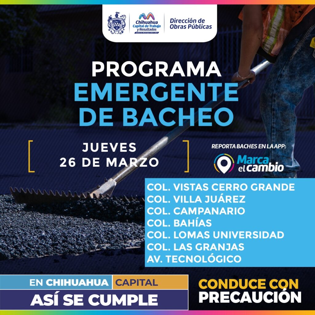 H. Ciudad de Chihuahua, Chih., a 26 de marzo de 2026.- El Gobierno Municipal, a través de la Dirección de Obras Públicas, realizará trabajos de bacheo este jueves 26 de marzo mediante el programa emergente en las calles de las colonias: Vistas Cerro Grande, Villa Juárez, Campanario, Bahías, Lomas Universidad y Las Granjas, así como en la avenida Tecnológico.