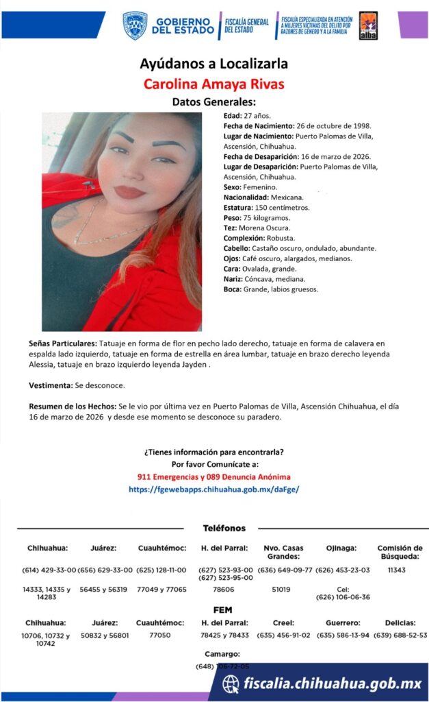 El primer caso corresponde a Carolina Amaya Rivas, de 27 años, quien fue vista por última vez el 16 de marzo en Puerto Palomas de Villa, en el municipio de Ascensión.