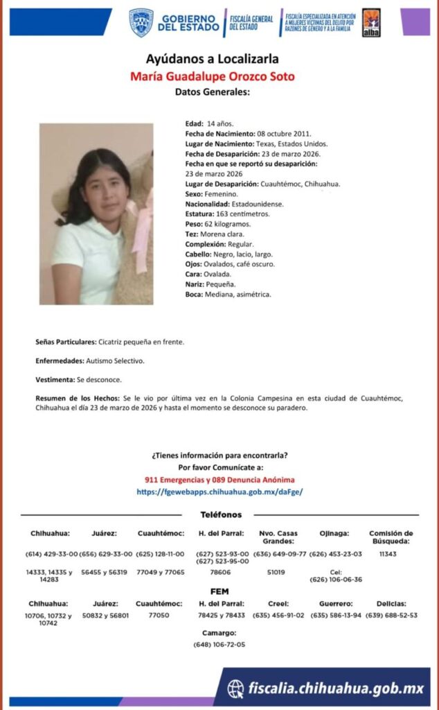 Tres días después, el 23 de marzo, se registró la desaparición de María Guadalupe Orozco Soto, de 14 años, quien fue vista por última vez en la colonia Campesina, en el municipio de Cuauhtémoc.
