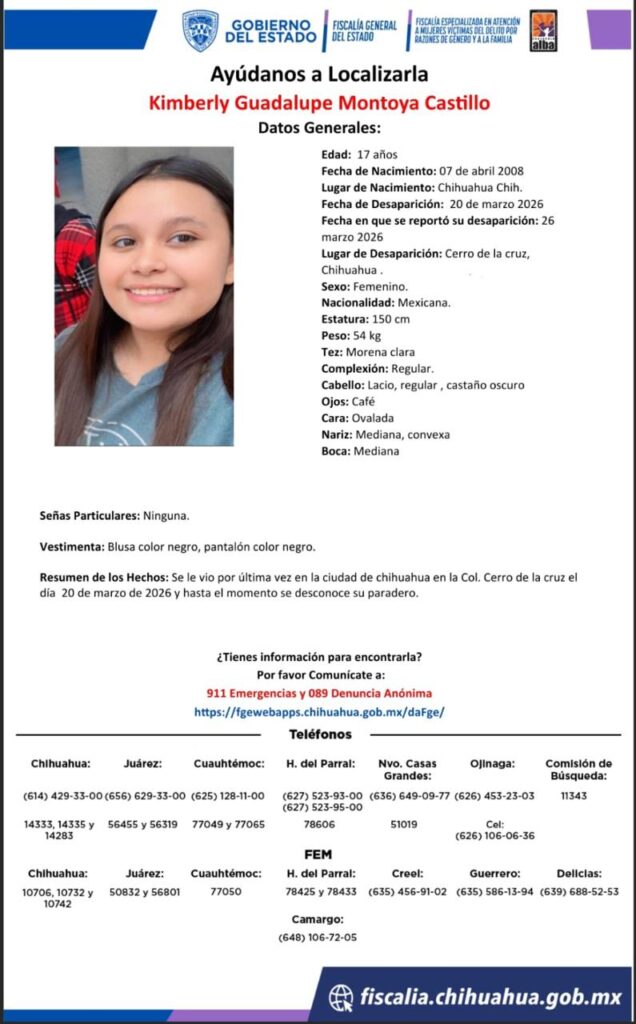 Posteriormente, el 20 de marzo, se reportó la desaparición de Kimberly Guadalupe Montoya Castillo, de 17 años, vista por última vez en la colonia Cerro de la Cruz, en la ciudad de Chihuahua.