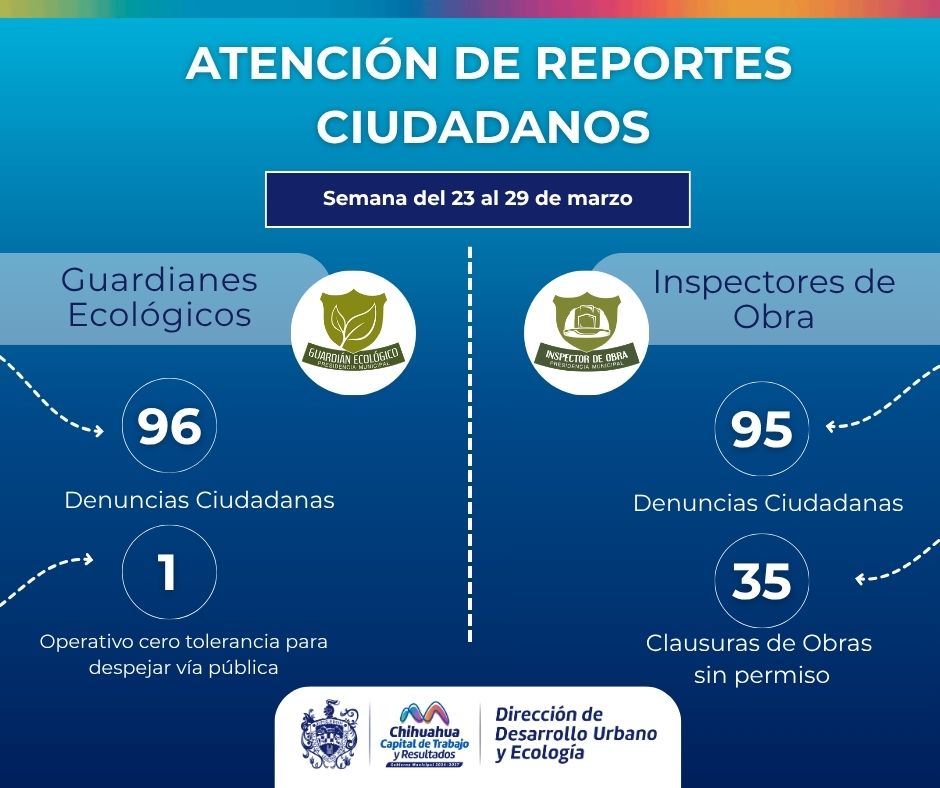 H. Ciudad de Chihuahua, Chih., a 30 de marzo de 2026.- El Gobierno Municipal de Chihuahua, a través de la Dirección de Desarrollo Urbano y Ecología, presenta el balance de actividades correspondientes al periodo del 9 de al 15 de marzo de 2026, reafirmando su compromiso con el orden, la legalidad y el cuidado del entorno.