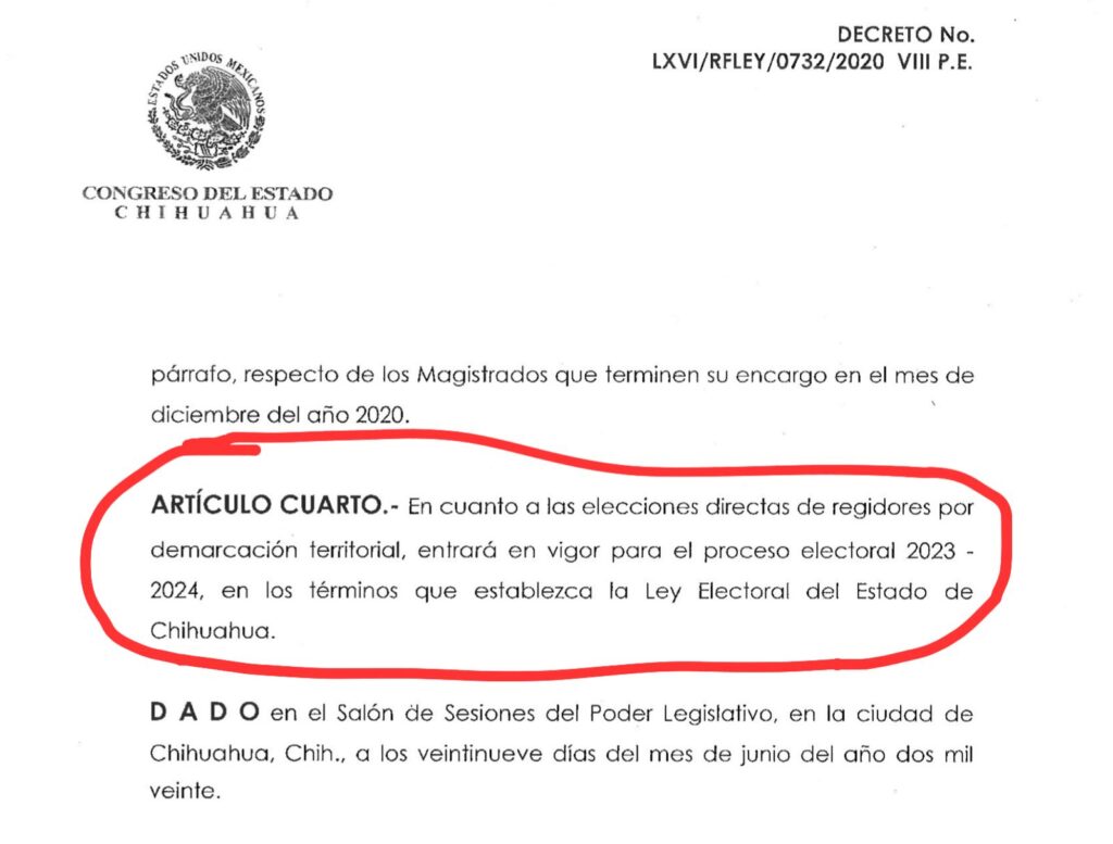Chihuahua, Chih.- El Tribunal Estatal Electoral (TEE) dio la razón a cuatro ciudadanos que reclamaron que el Congreso del Estado ha dejado “en pausa” la elección directa de regidores aprobada en el estado desde el 2020 y cuya aplicación se acordó para el 2023, siendo esto ignorado hasta la fecha. Por ello, ordenó a los diputados atender el tema y avanzar, o podrían enfrentar sanciones.