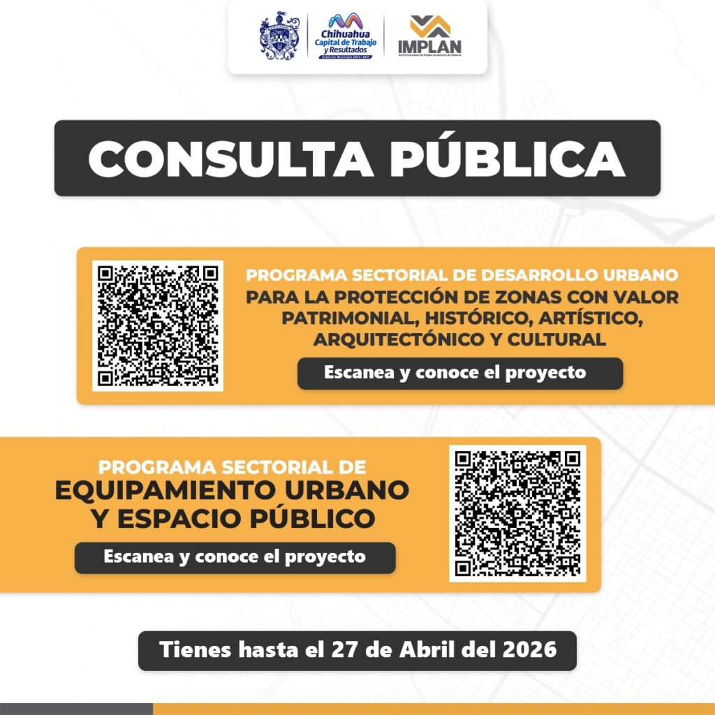 H. Ciudad de Chihuahua, Chih., a 2 de abril de 2026.- El Gobierno Municipal de Chihuahua, a través del Instituto de Planeación Integral del Municipio (IMPLAN), invita a la ciudadanía a participar en la consulta pública del Programa Sectorial de Patrimonio y del Programa Sectorial de Equipamiento Urbano y Espacio Público, acción que fortalece la planeación y consolida el compromiso cumplido con la ciudad.