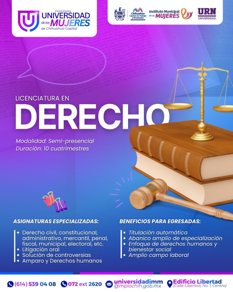 H. Ciudad de Chihuahua, Chih., a 07 de abril del 2026.– Con el objetivo de seguir generando más oportunidades de desarrollo profesional para las mujeres, el Gobierno Municipal de Chihuahua, a través del Instituto Municipal de las Mujeres (IMM), en alianza con la Universidad Regional del Norte (URN), inició las inscripciones a la Universidad de las Mujeres con las licenciaturas en Derecho y Administración de Empresas Turísticas.