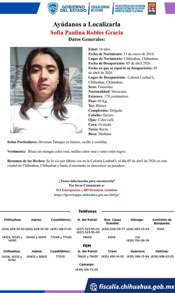 Ese mismo 5 de abril se reportó la desaparición de la menor Sofía Paulina Robles Gracia, de 16 años, vista por última vez en la colonia Lealtad I, en la capital del estado.