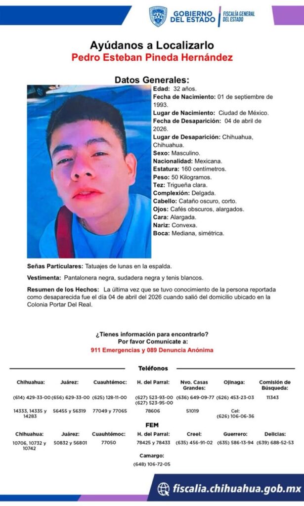 Entre los casos se encuentra Pedro Esteban Pineda Hernández, de 32 años, visto por última vez el 4 de abril en la colonia Portar del Real, en la ciudad de Chihuahua.