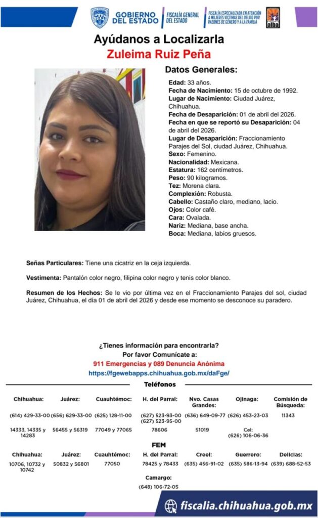 En Ciudad Juárez, Zuleima Ruiz Peña, de 33 años, fue vista por última vez el 1 de abril en el fraccionamiento Parajes del Sol.