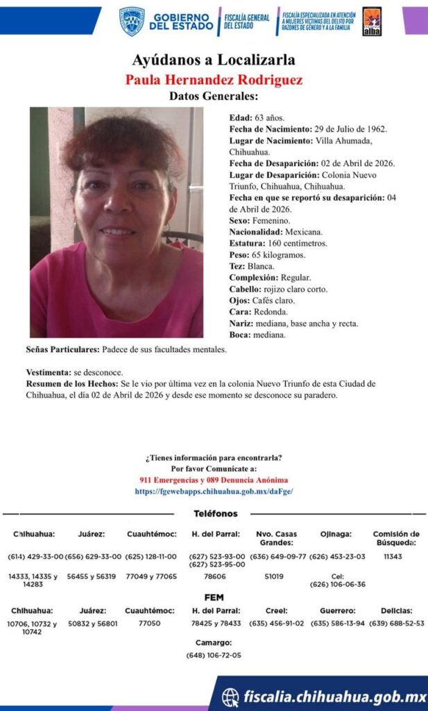 Asimismo, Paula Hernández Rodríguez, de 63 años, fue reportada cómo desaparecida tras ser vista por última vez el 2 de abril en la colonia Nuevo Triunfo, en la ciudad de Chihuahua.