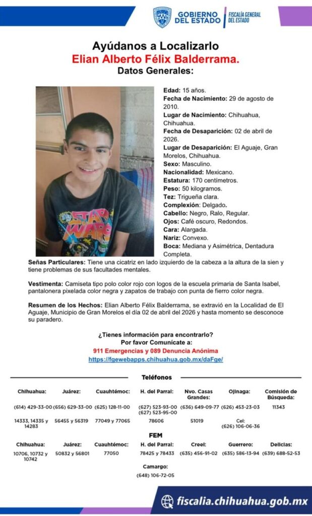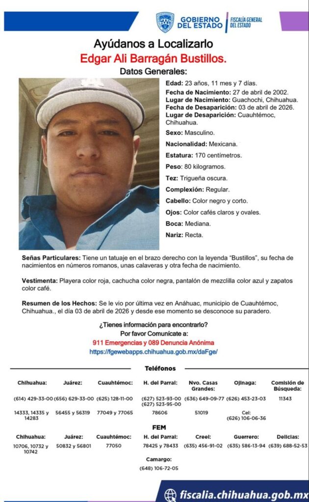 Chihuahua, Chih-. En el transcurso de abril de 2026, al menos ocho personas han sido reportadas como desaparecidas en distintos puntos del estado, de acuerdo con fichas de búsqueda emitidas por la Fiscalía General del Estado (FGE) de Chihuahua.