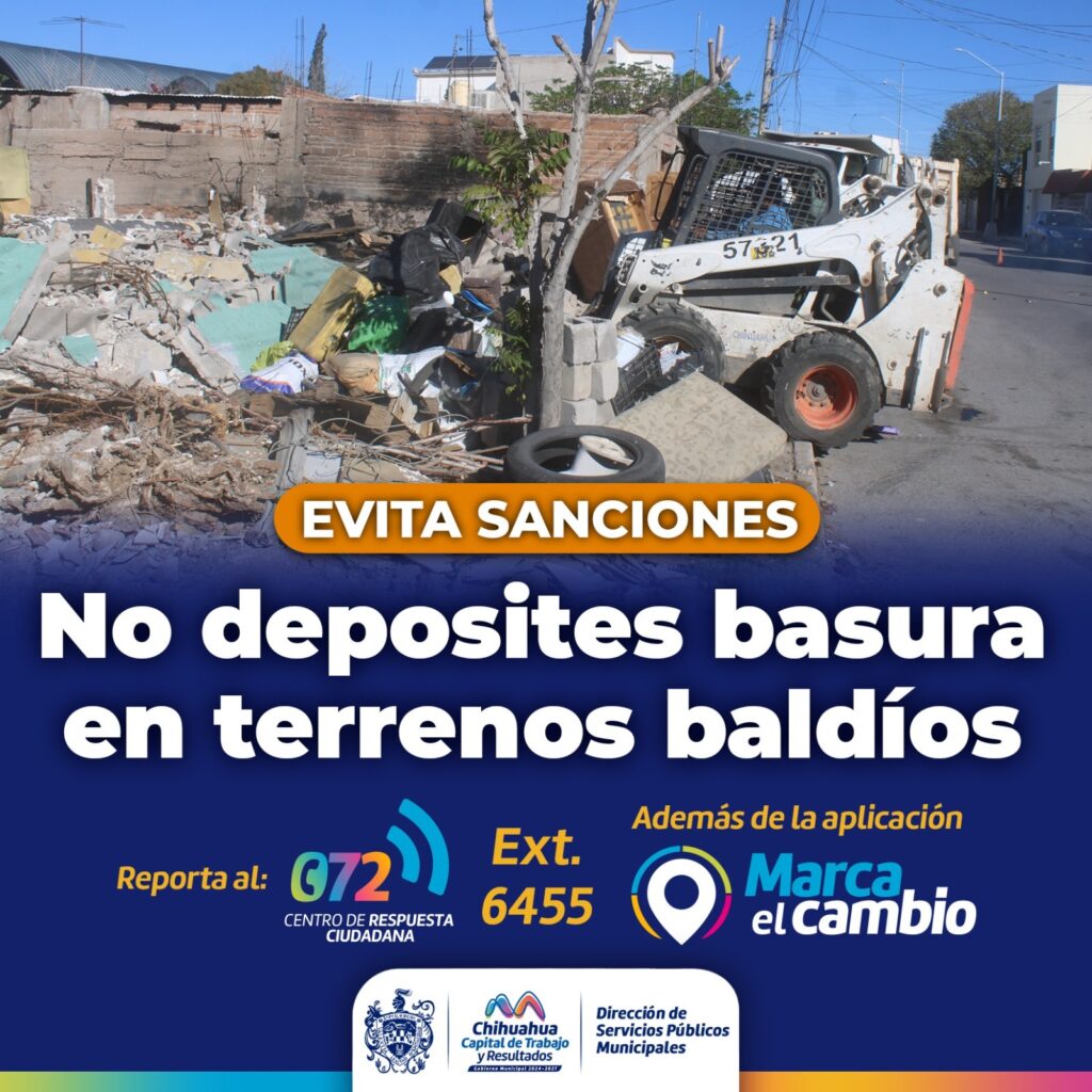 H. Ciudad de Chihuahua, Chih., a 8 de abril de 2026.- Con el objetivo de mantener una buena imagen urbana, el Gobierno Municipal, a través de la Dirección de Servicios Públicos Municipales, exhorta a evitar tirar basura o escombro en viviendas abandonadas y terrenos baldíos de la ciudad. Contaminar estos espacios genera una mala imagen urbana, entornos propicios para la proliferación de fauna nociva para la salud de las y los chihuahuenses y provoca que se conviertan en un foco de infección.
