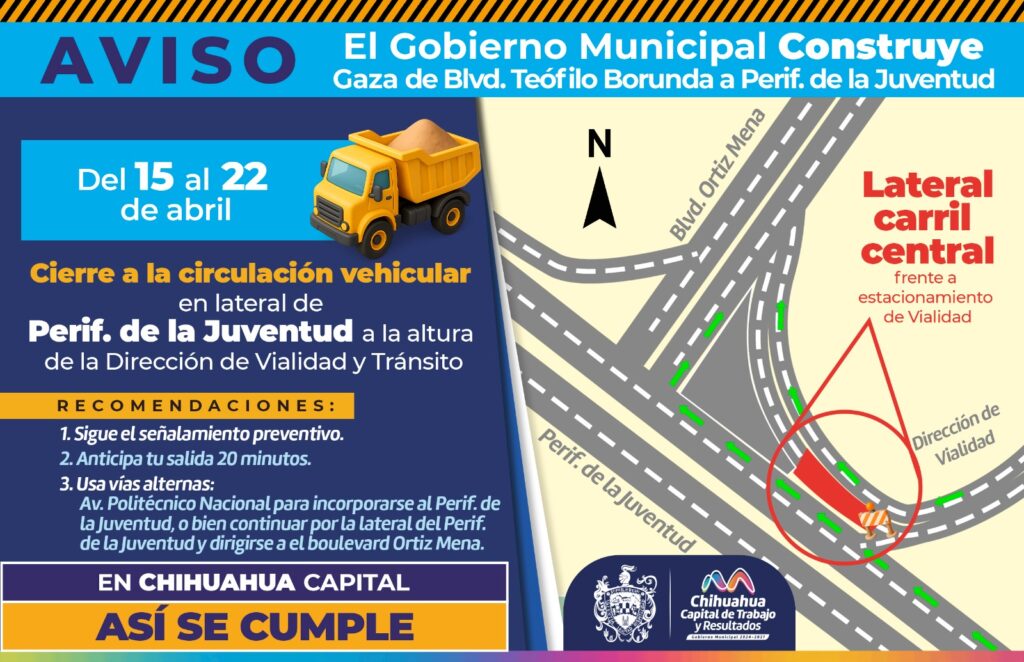 H. Ciudad de Chihuahua, Chih., a 9 de abril de 2026.- El Gobierno Municipal, a través de la Dirección de Obras Públicas, emite una alerta vial por el cierre temporal a la circulación en la lateral del periférico de la Juventud, a la altura de las oficinas de la Dirección de Vialidad y Tránsito, debido a trabajos de modernización de la línea de agua potable, como parte de la construcción de la Gaza de Incorporación.