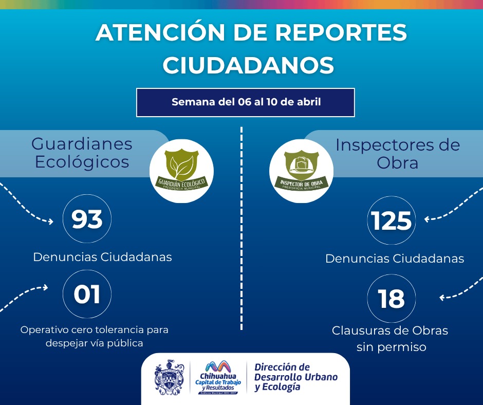 H. Ciudad de Chihuahua, Chih., a 13 de abril de 2026.- El Gobierno Municipal de Chihuahua a través de la Dirección de Desarrollo Urbano y Ecología, presenta el balance de actividades correspondientes al periodo del 6 al 10 de abril de 2026, reafirmando su compromiso con el orden, la legalidad y el cuidado del entorno.