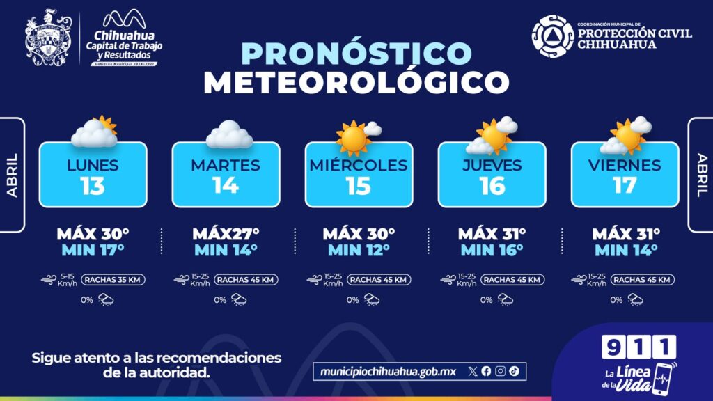 H. Ciudad de Chihuahua, Chih., a 13 de abril de 2026.- El Gobierno Municipal de Chihuahua, a través de la Coordinación Municipal de Protección Civil, informa que esta semana se esperan días calurosos donde predominan días nublados, sin probabilidad de lluvias.