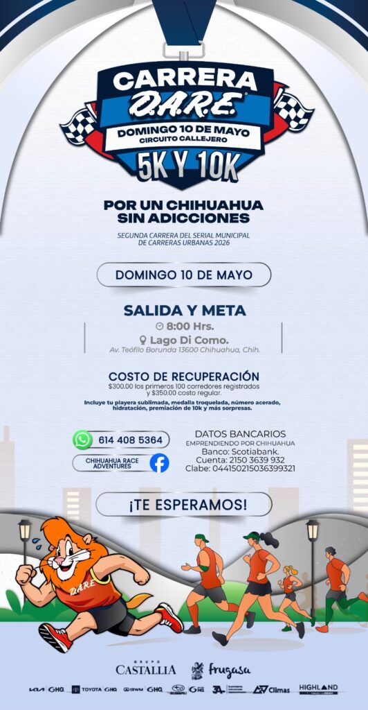 H. Ciudad de Chihuahua, Chih., 17 de abril de 2026.- En el marco del 20 aniversario del programa DARE, la Policía Municipal, en conjunto con el Patronato D.A.R.E. Chihuahua, invita a la ciudadanía a participar en la carrera “Por un Chihuahua sin adicciones”, que se realizará el próximo 10 de mayo a las 8:00 horas.