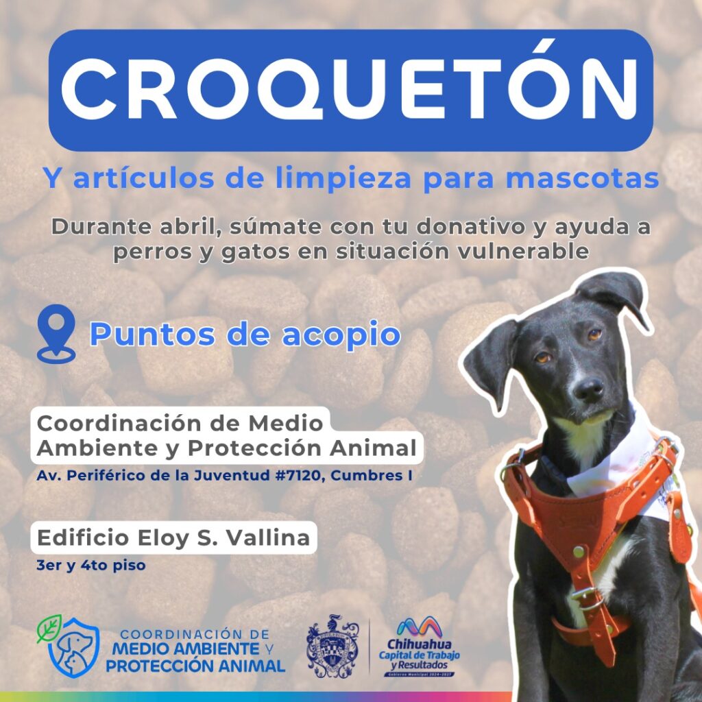 H. Ciudad de Chihuahua, Chih., a 20 de abril de 2026.- La Coordinación de Medio Ambiente y Protección Animal, invita a “Croquetón”, donde empresas, comercios y ciudadanía podrán donar croquetas y artículos de limpieza para beneficio de perros y gatos en situación vulnerable, mejorando su cuidado y fortaleciendo el apoyo a refugios del Gobierno Municipal.