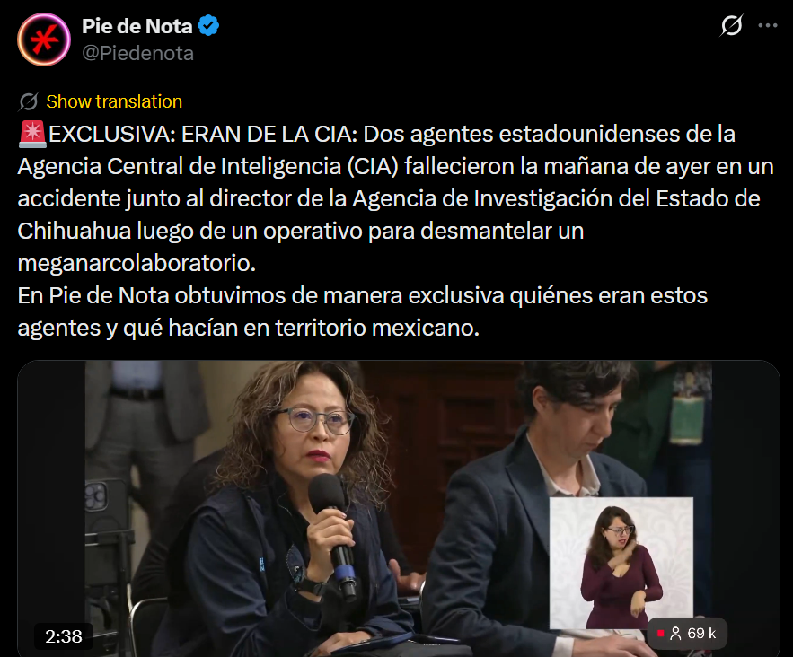 “Es una total mentira del Fiscal General de Chihuahua: Pie de Nota obtuvo incluso los nombres de los agentes estadounidenses y confirmó que son 4 agentes (dos de ellos los fallecidos) y que fue la tecnología de la CIA la que ubicó el narcolaboratorio, por eso su presencia en tierra”, afirmó el periodista Luis Chaparro en su cuenta de X.