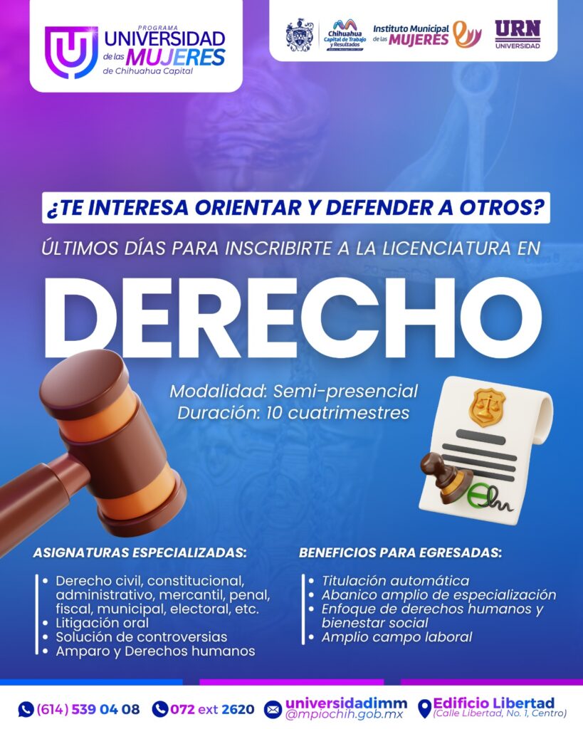 H. Ciudad de Chihuahua, Chih., a 21 de abril de 2026.– Porque el acceso a la justicia también se construye desde la educación, el Gobierno Municipal de Chihuahua, a través del Instituto Municipal de las Mujeres (IMM), invita a las mujeres a formar parte de la Licenciatura en Derecho en la Universidad de las Mujeres.