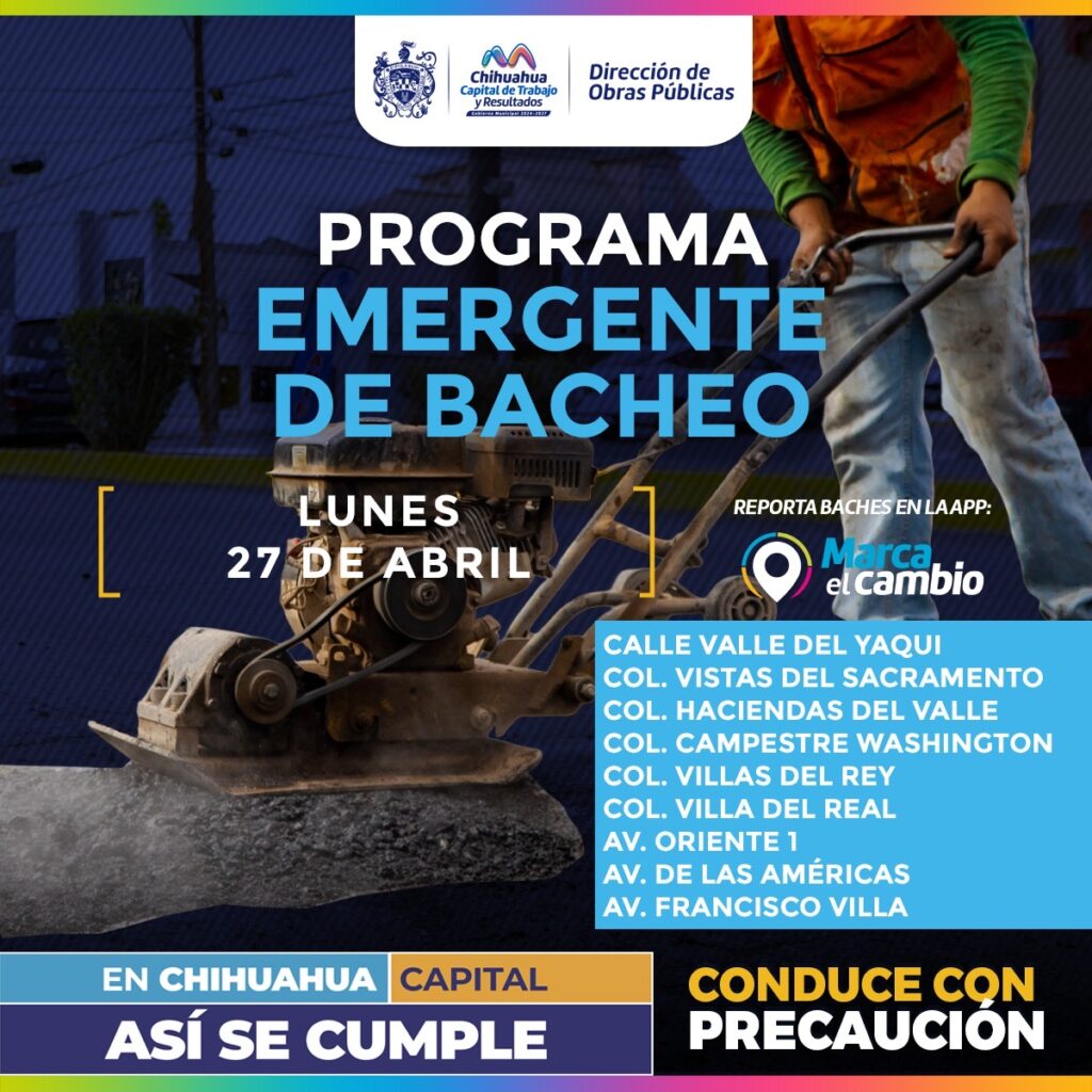 H. Ciudad de Chihuahua, Chih., a 27 de abril de 2026.- El Gobierno Municipal, a través de la Dirección de Obras Públicas, realizará trabajos de bacheo este lunes 27 de abril mediante el programa emergente e la calle Valle del Yaqui así como en las colonias: Vistas del Sacramento, Haciendas del Valle, Campestre Washington, Villas del Rey, Villa del Real y en las avenidas Oriente 1, De las Américas y Francisco Villa.